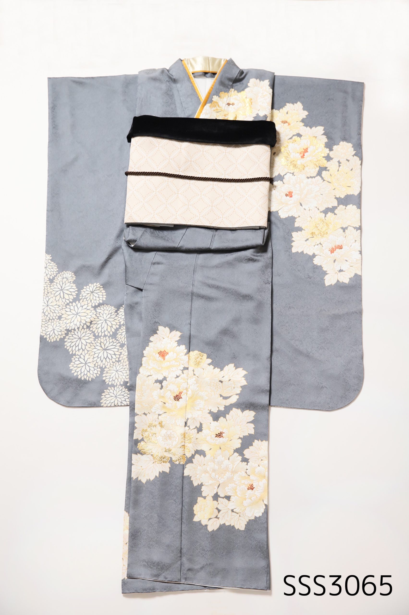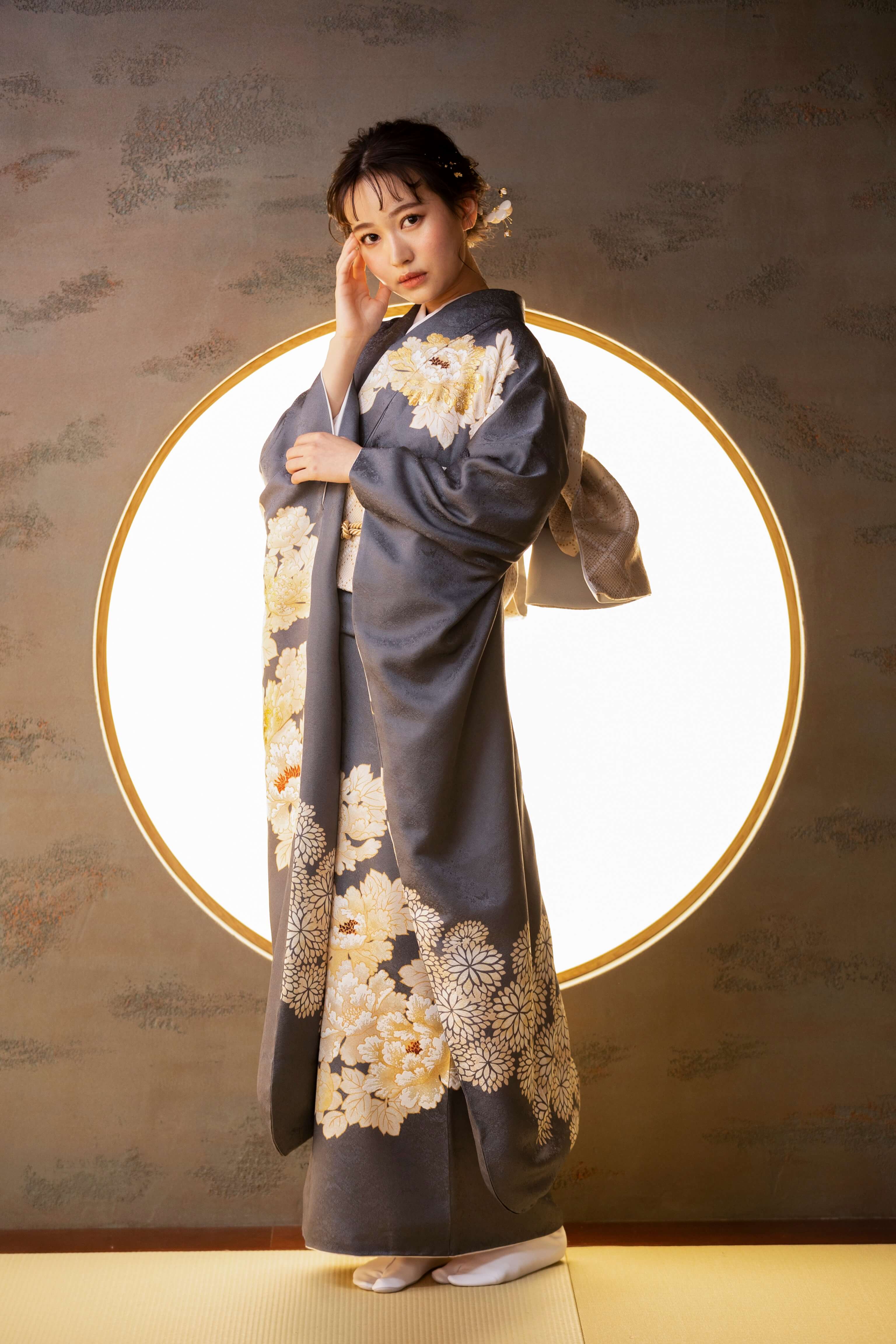 大きめの模様が全面に入っており、華やかな印象がありつつも、色使いが落ち着いていて、大人っぽい雰囲気のあるお衣装です。