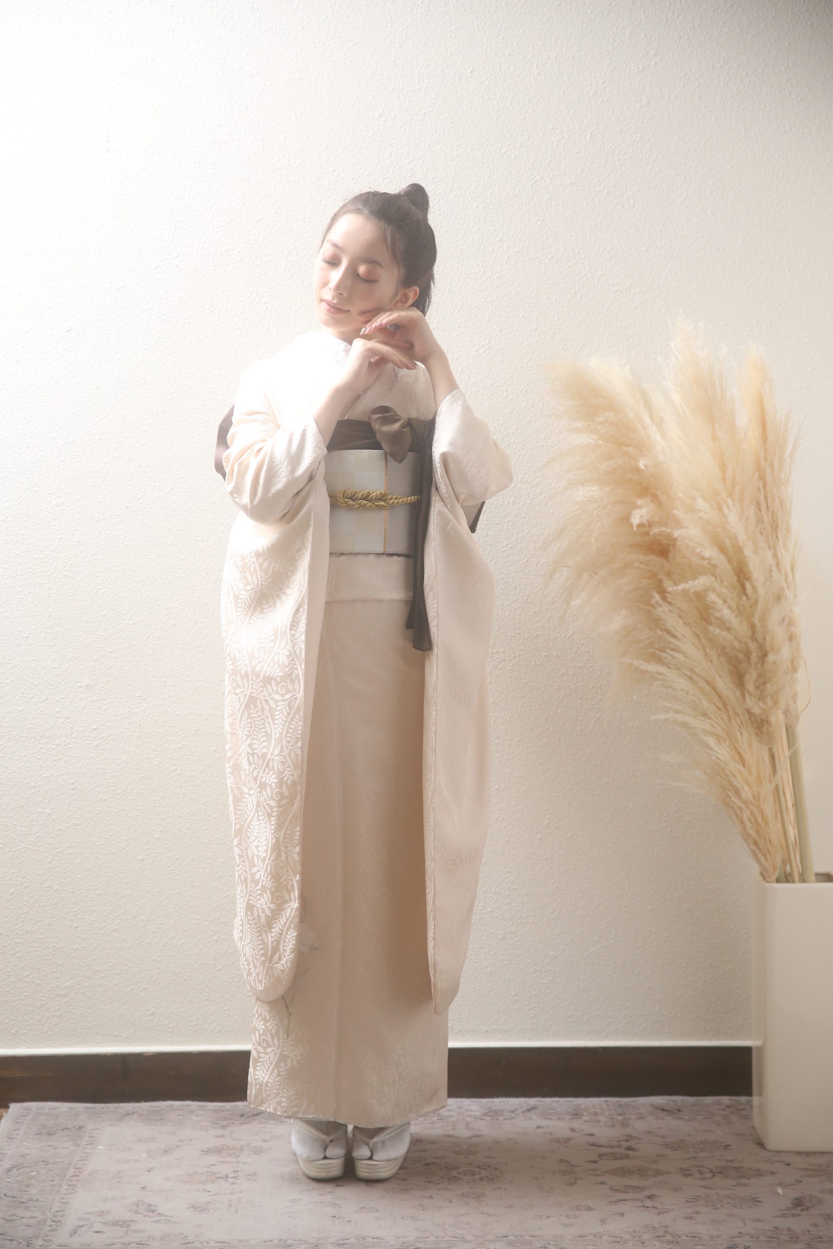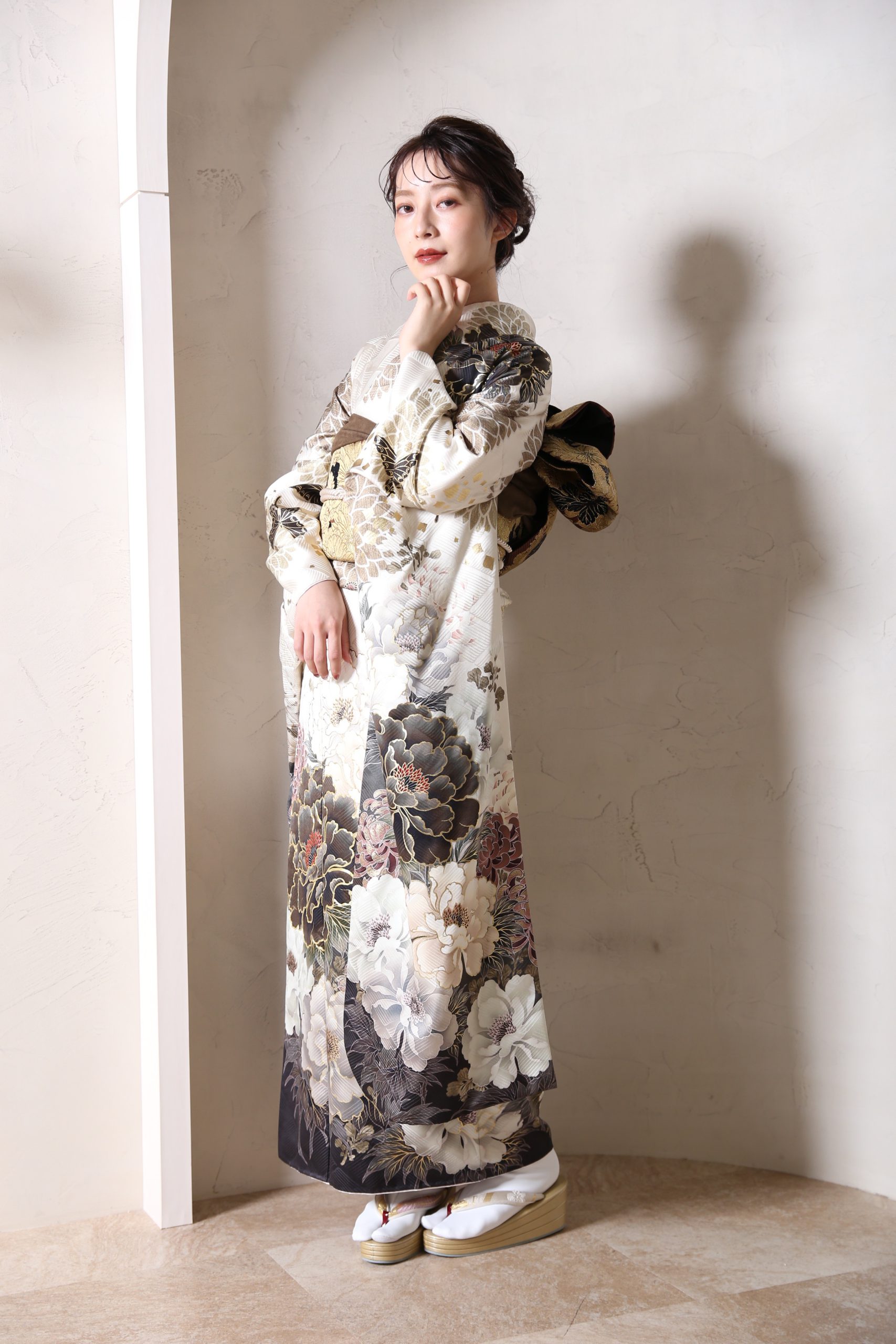 光沢のあるベージュがかった白の生地に、濃いブラウンや白のお花、蝶の模様があしらわれたお衣装です。