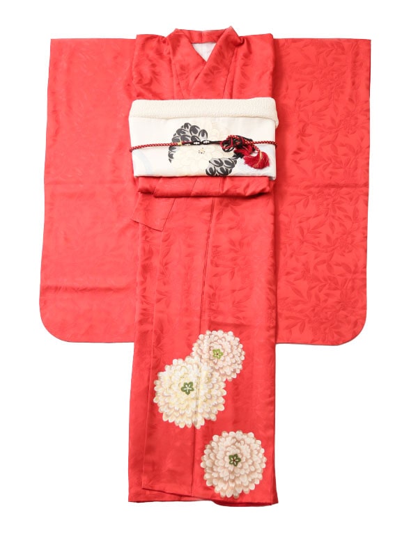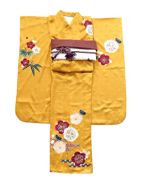 黄色の振袖で今っぽくもなりますすが、赤と白のお花が入っている着物は