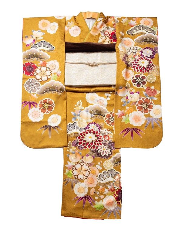先程の赤の時と同じように、からし色に近いお色味の振袖にすることで、