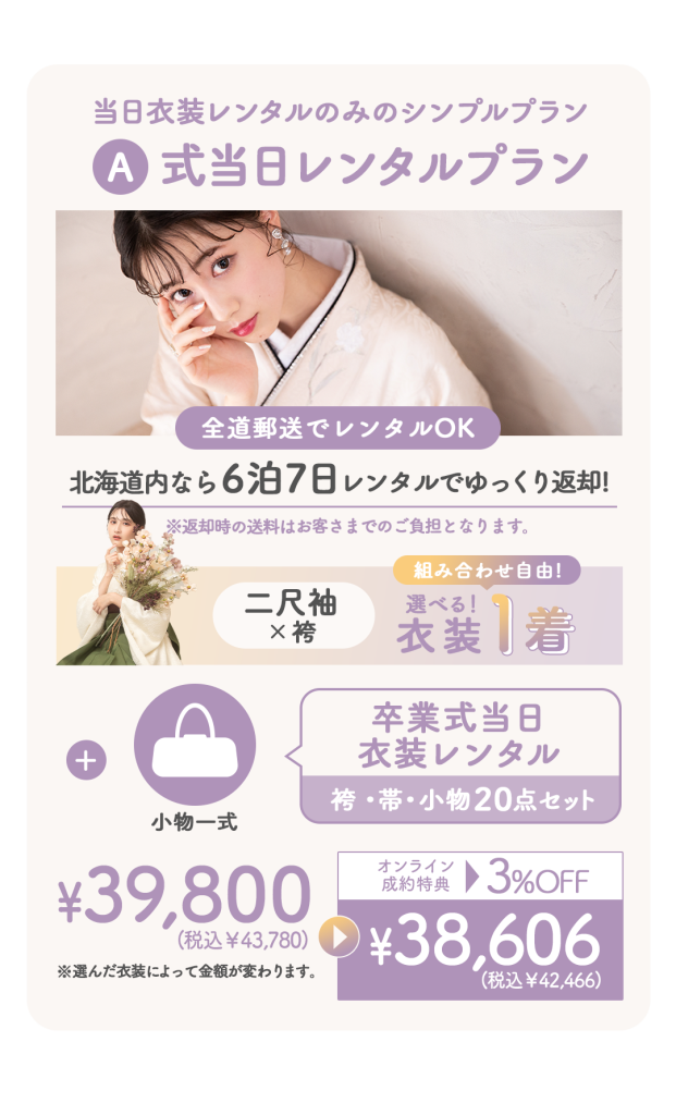 ※着付けなし振袖レンタルのみご希望の方は6泊7日レンタルでゆっくり返却OK(北海道内限定)