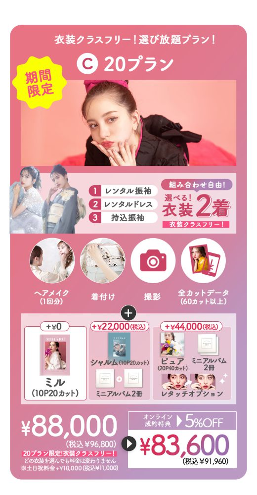 今までは、選ぶ振袖によって料金が変わっていた成人のプランですが、