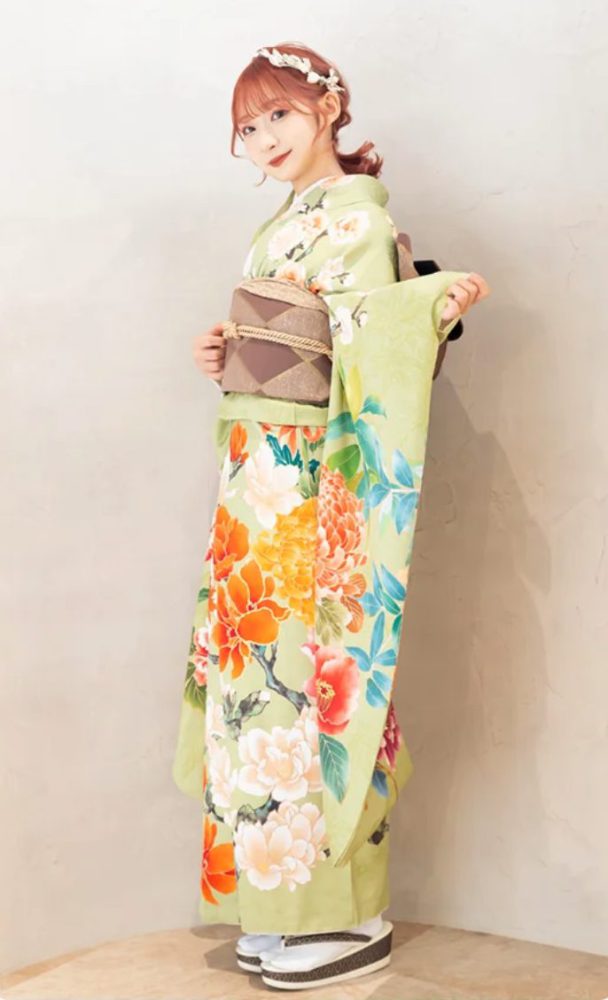 明るいグリーンの振袖は、成人式に参加した時にも目立つ華やかさ!