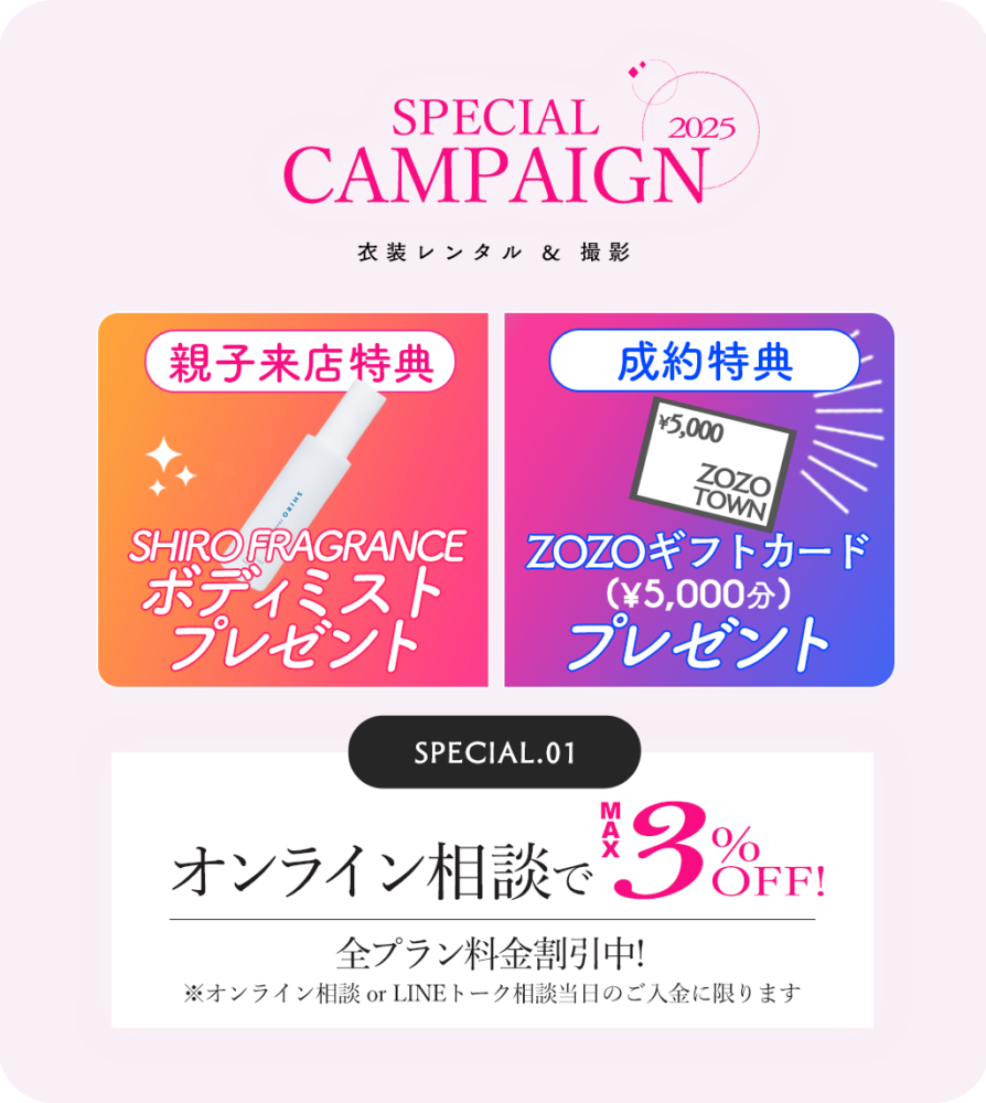 ①前撮り&レンタルがセットになった「コミコミセット」なら