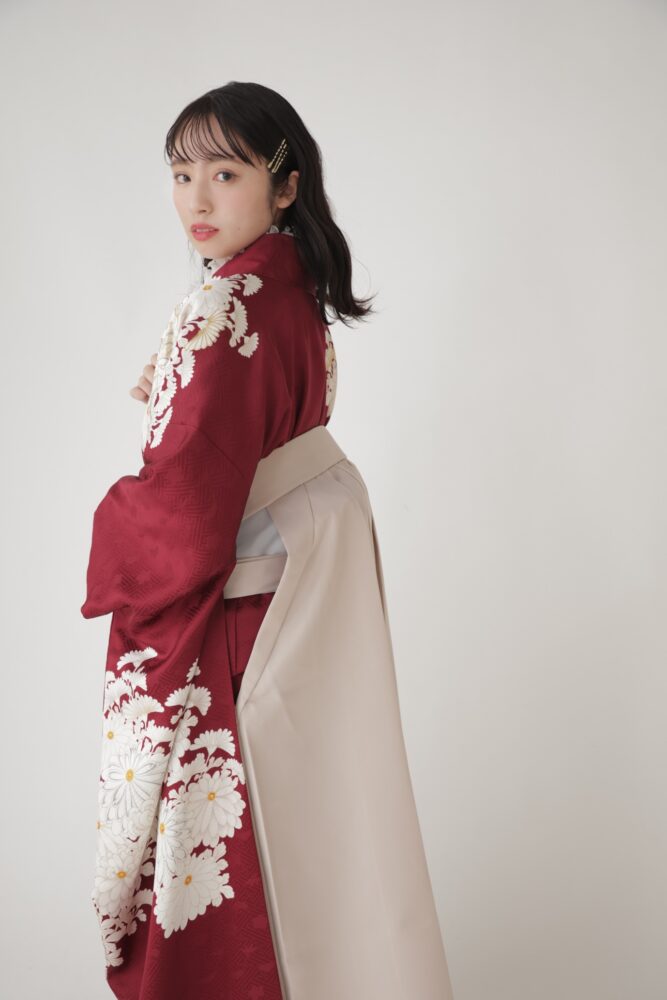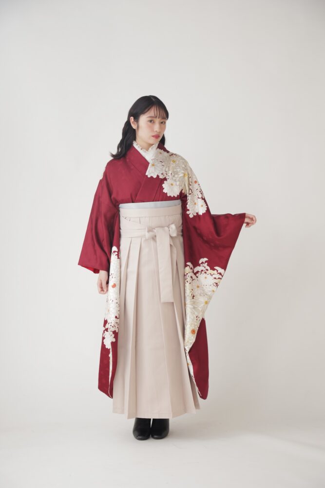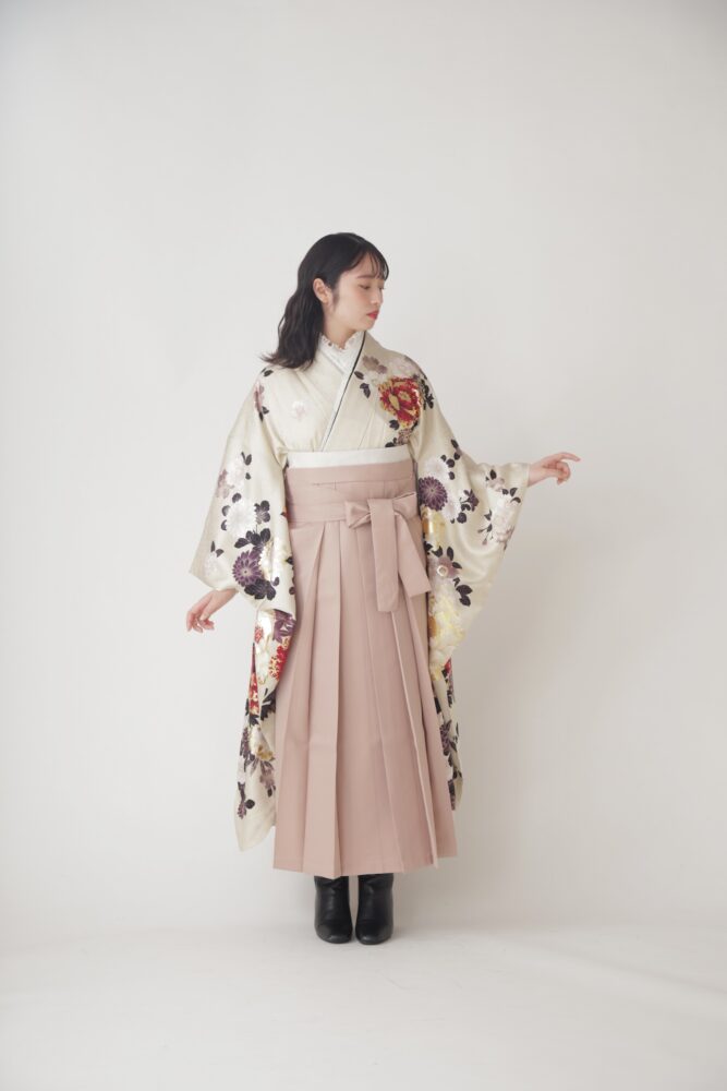 こちらは深い色味の振袖と、明るいアイボリーの袴を合わせました。