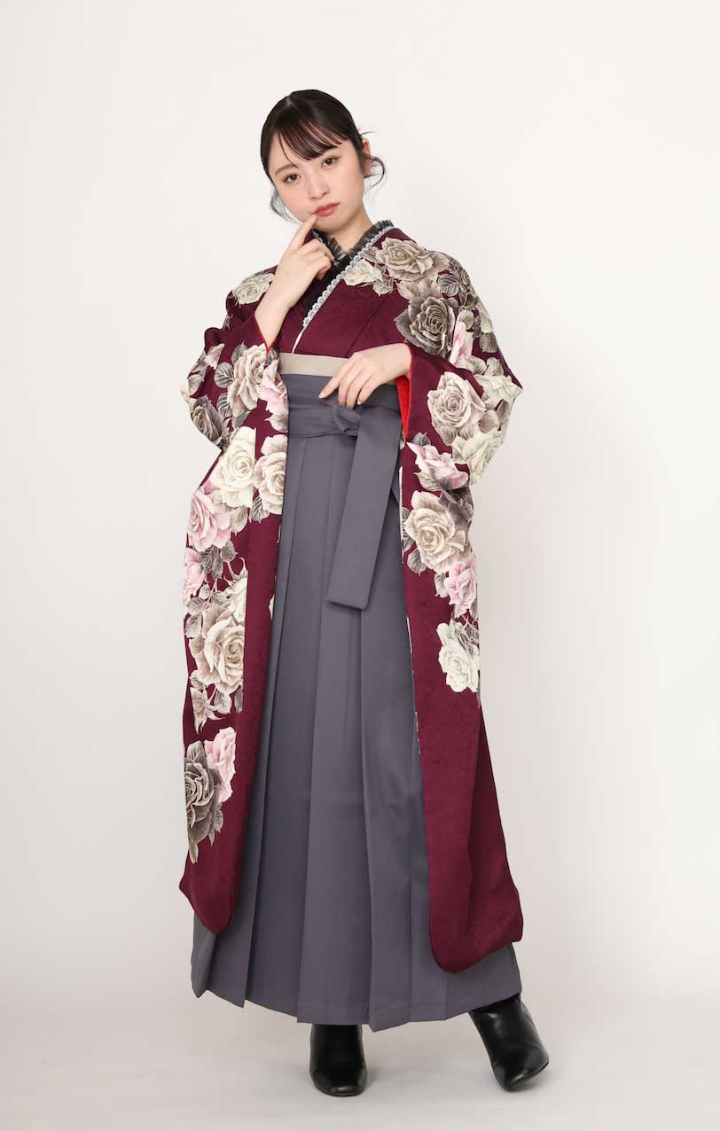 目を引くボルドーに華やかなバラがたくさん散りばめられている振袖。