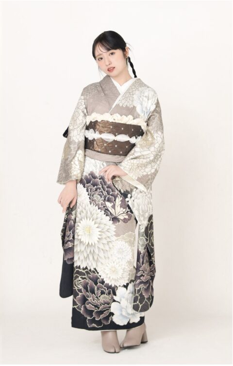 こちらはくすみカラーの振袖に大柄の花と蝶がデザインされています。
