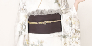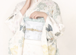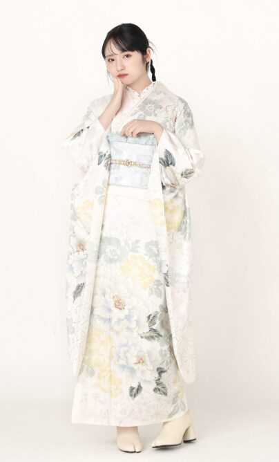 オフホワイトにくすみグリーンやイエローのニュアンスカラーに同系色の白やシルバーの帯を合わせることで
