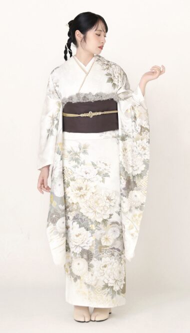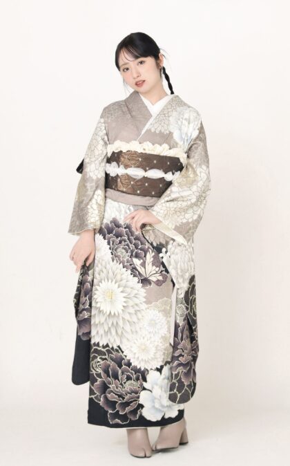 こちらはアイボリーを基調にグレージュなどの淡い色味の振袖に濃いブラウンの帯を合わせることで全体を引き締め、メリハリのあるコーディネートになります。