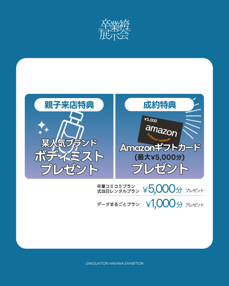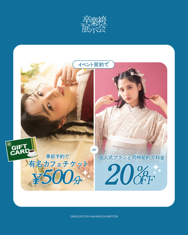 最新卒業袴の見学&無料試着会や、嬉しいプレゼントを多数ご用意。