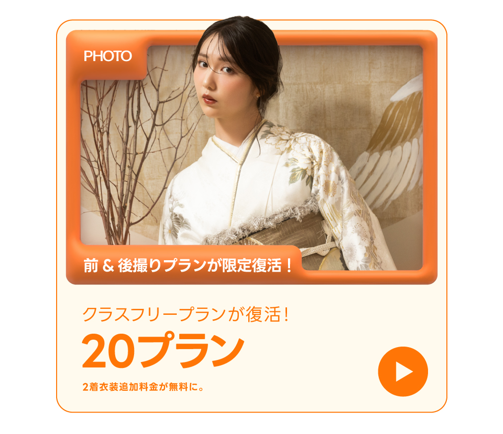 前撮りで超絶人気だった20プランが生まれ変わって再登場!衣装2着の追加料金が0円の20プランが復活!