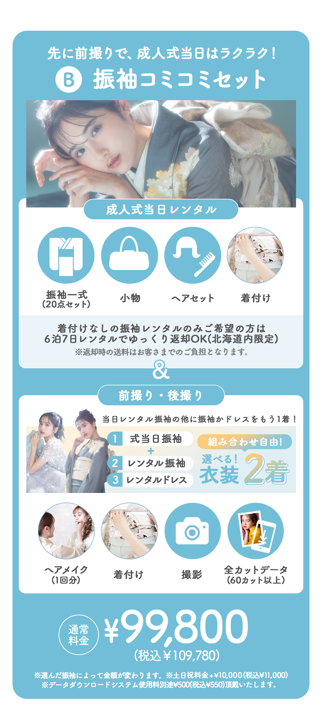 写真だけの成人式(前・後撮り)も、振袖レンタルも両方¥29,800(税込¥32,780)からご案内!