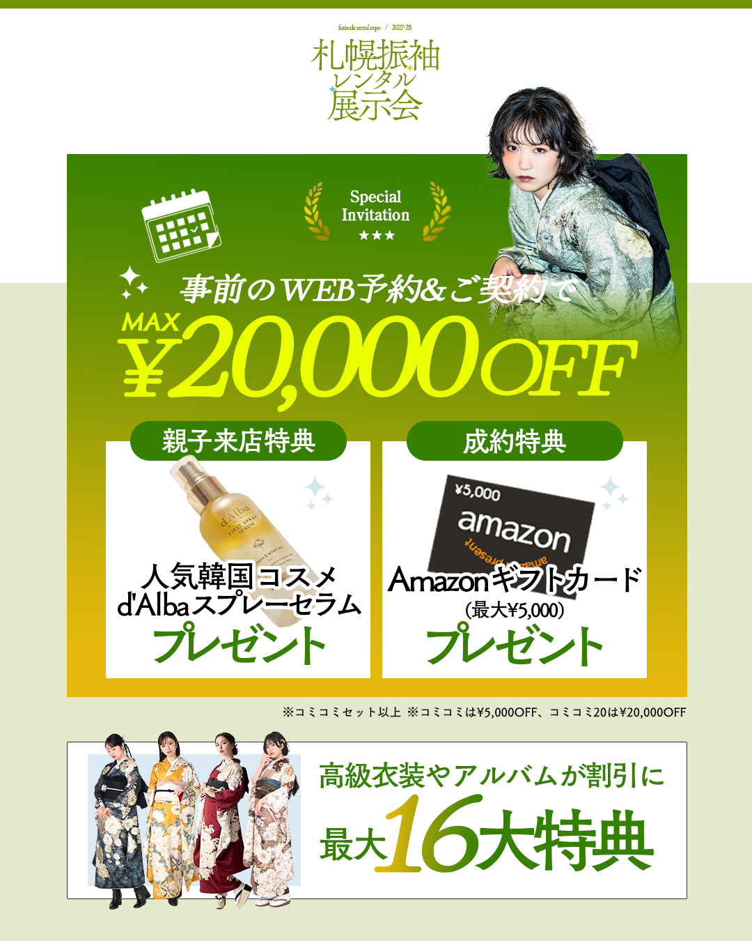 新作振袖の半額キャンペーンや、総額数万円相当の無料特典など、