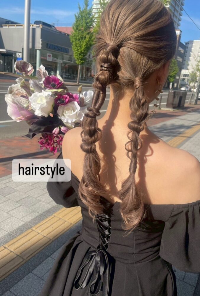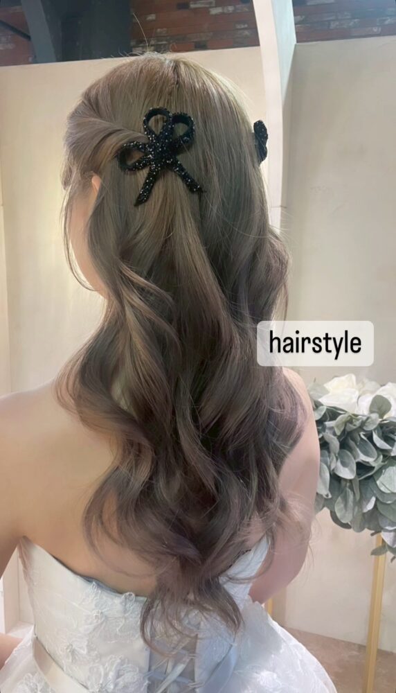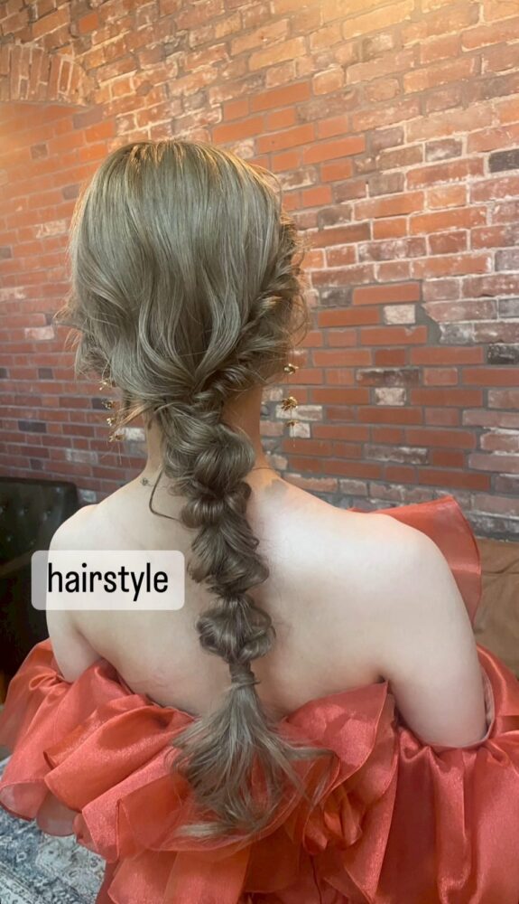 長い髪を活かして、サイドや後ろで編み込んで流すスタイルです。