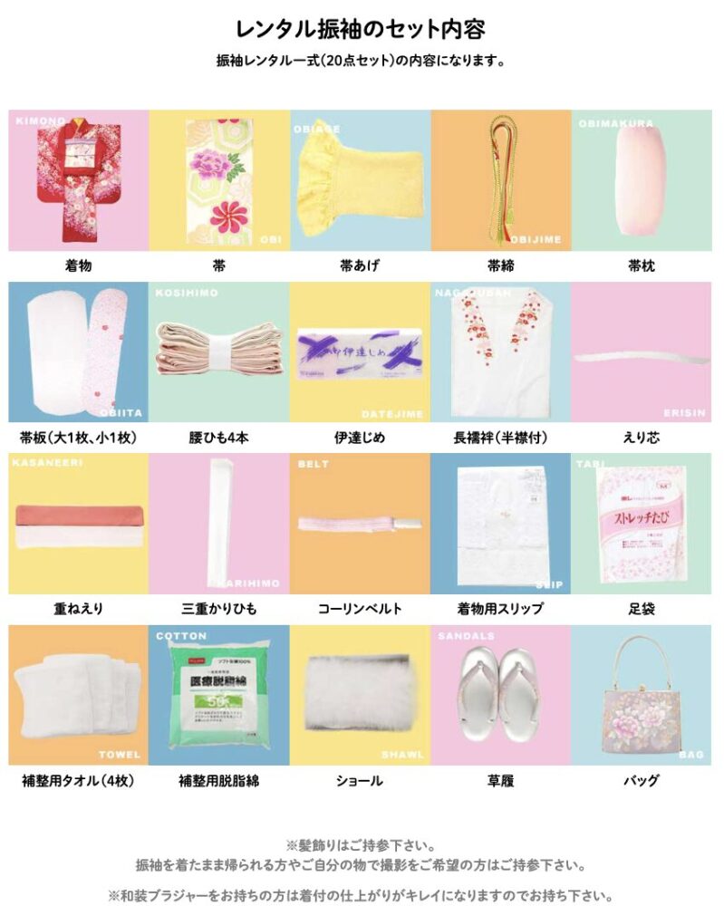 振袖から帯、バッグ、草履、さらには着付けに必要な腰紐や補正用のタオルまで全てセットに含まれています 。準備するのは「髪飾り」だけで大丈夫です 。