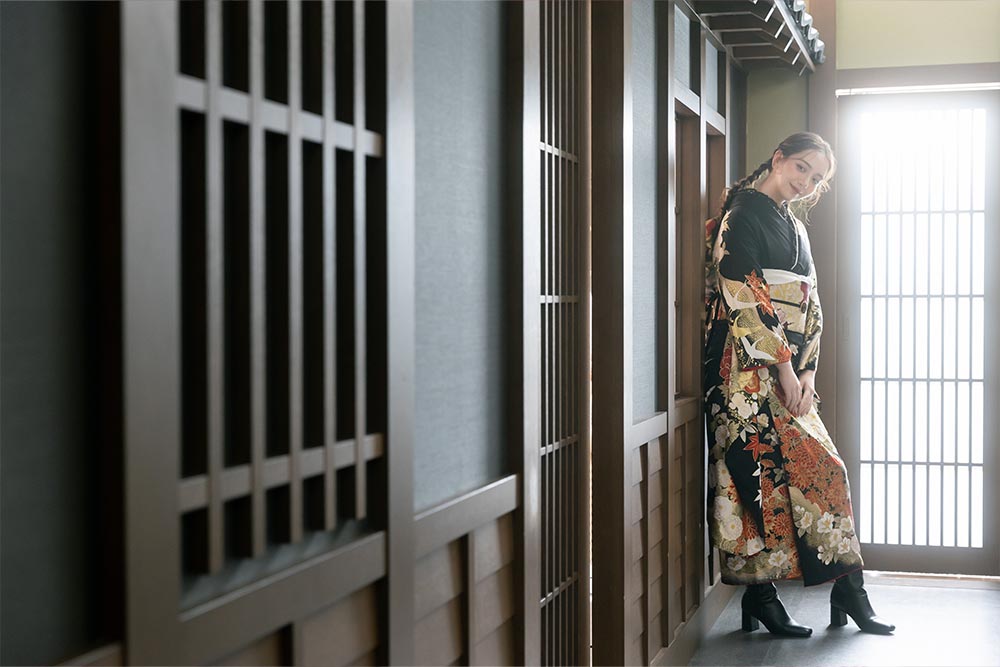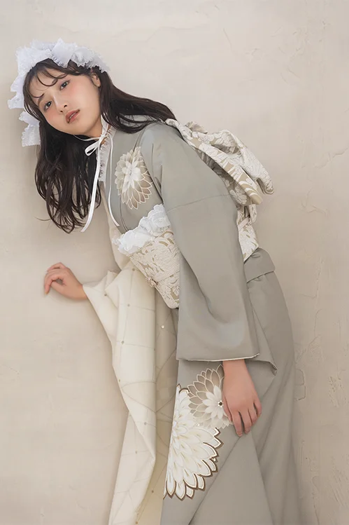 原色ではない、マットな質感の振袖は、ドライフラワーの髪飾りとも相性抜群です 。