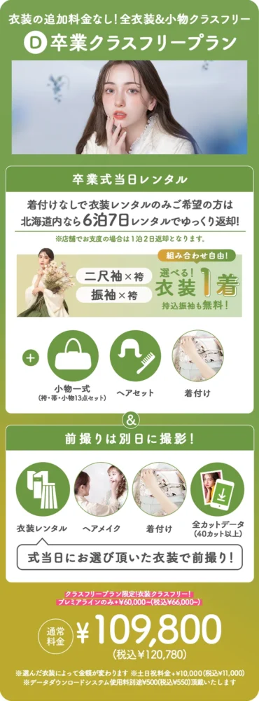 卒業クラスフリーplan(109,800円〜+税): 式当日の袴レンタルと前撮りがセットになり、さらに衣装の追加料金がかからない(プレミア除く)ファクトリー店限定のお得な内容です 。