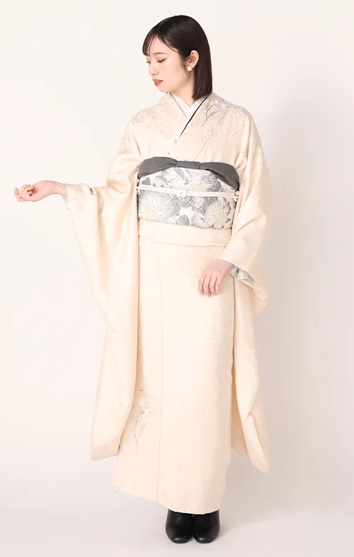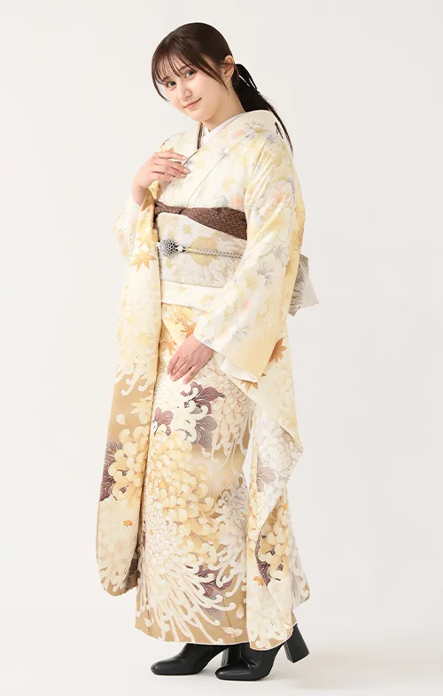 スタッフのアドバイス:ぱれっとでは、振袖だけでなく小物(帯揚げ・帯締め・重ね襟など)もトータルでコーディネート可能です 。秋タイプの方に似合うゴールド系の小物使いで、ワンランク上の装いをご提案します 。