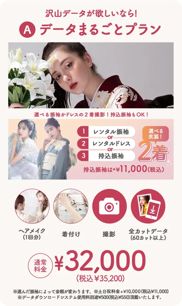 ヘアメイク、着付け、撮影、全カットデータ(60カット以上)が含まれます 。