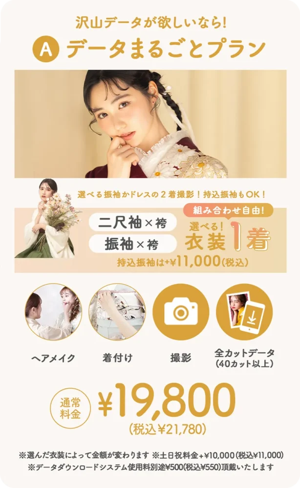 A:データまるごとplan:19,800円〜(+税)。撮影データをダウンロードですぐにお渡しします(40カット以上)。