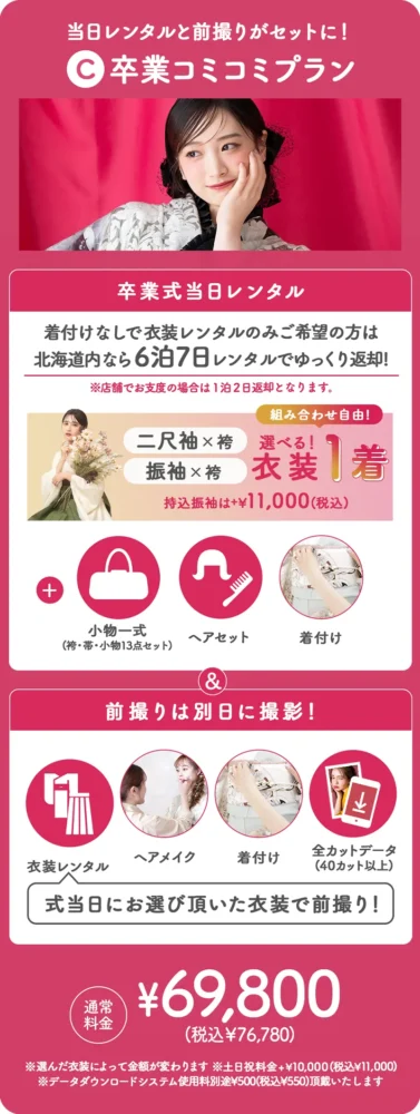 C:卒業コミコミplan:69,800円〜(+税)。式当日レンタルと前撮りがセットになった安心プランです 。