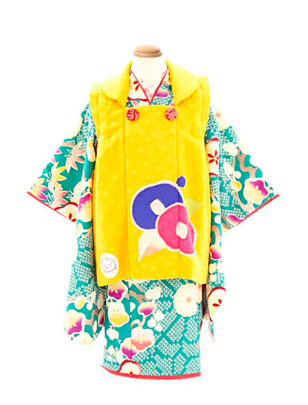 水色の着物に黄色の被布を合わせたスタイル。