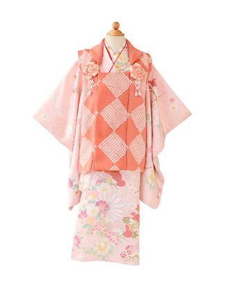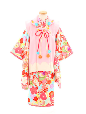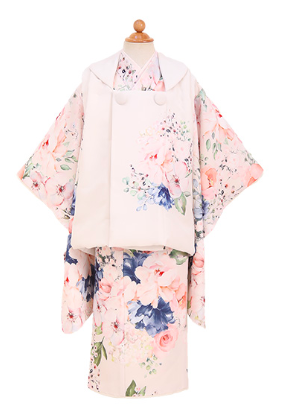 柔らかいピンク色の着物に花柄があしらわれた女の子らしい1着。