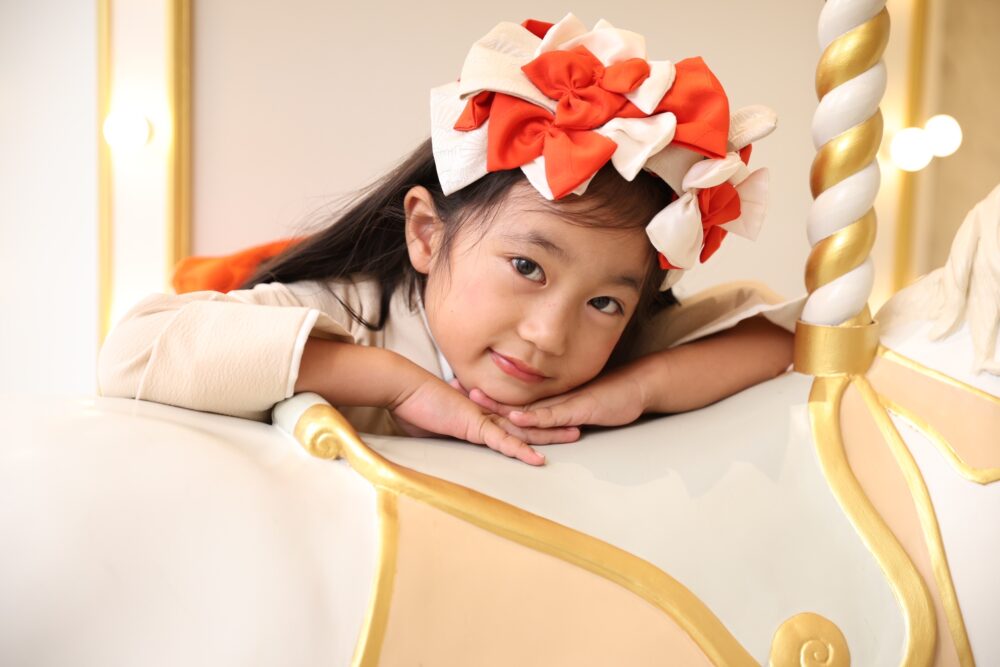 衣装の色味に合わせて髪飾りの色もリンクさせてあげると、よりお洒落に仕上がります。