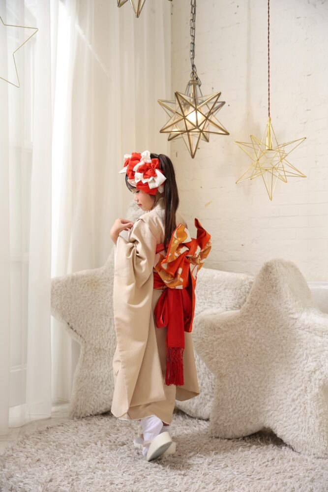 こちらはベージュのシンプルな生地に赤の帯や小物がポイントのお着物。
