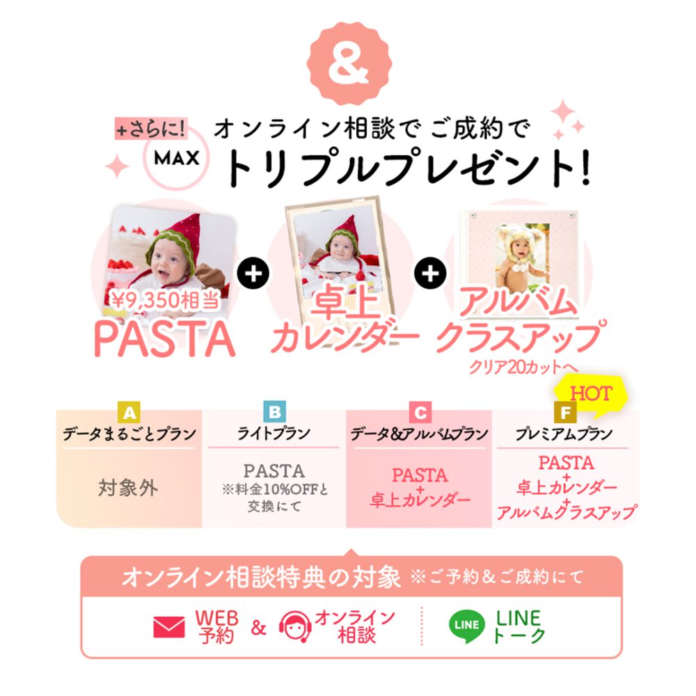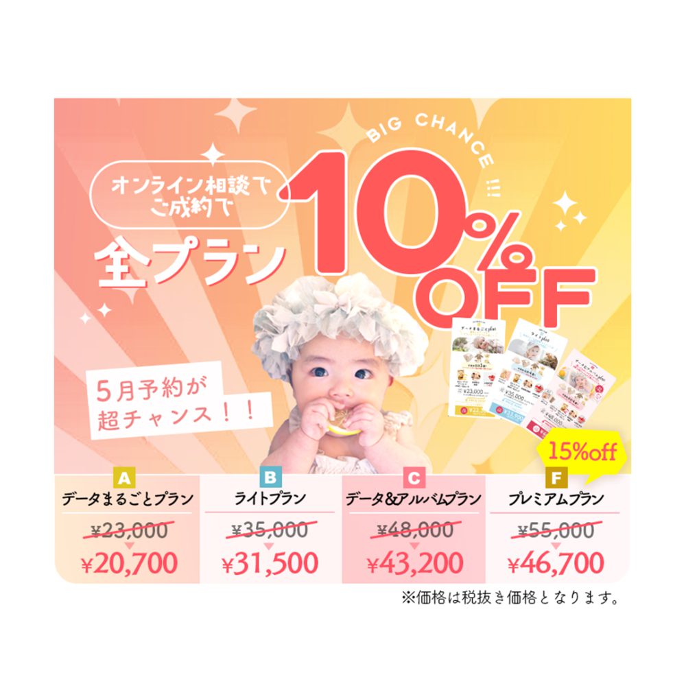 撮影予約をするならご自宅でできるオンライン相談からの予約がとってもお得です!ぜひ最後までお付き合いくださいませ☆