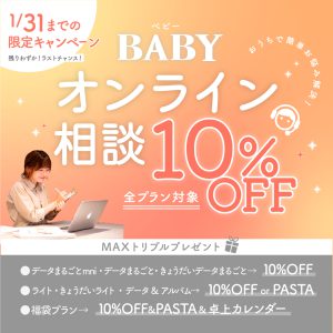 皆様こんにちは! 北海道函館市にある写真工房ぱれっと函館店です! 【緊急企画!】ベビーの撮影がもっとお得に撮れるキャンペーンが決定しました! 1/31(水)までにオンライン相談をしていただいた方限定キャンペーンとなります ぜひ最後までお付き合いくださいませ★