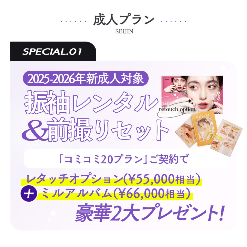 成人記念の前撮り撮影の料金プランは「なにがプラン内でできるのか」をしっかりと確認をしておきましょう◎