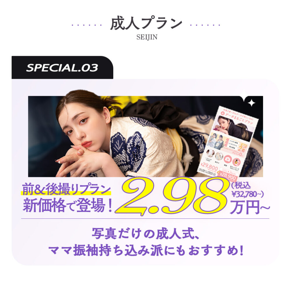 成人式の基本的な前撮りプランは、大きく分けて3パターン。