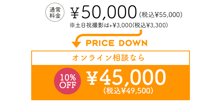 えっ!撮影予約はしたのにオンラインしてないの!?オンライン相談でプラン料金から10%OFF! さらに8,500円以上相当の特典があるのに・・!もったいない!! とてもお得なオンライン相談簡単!予約するしか!!