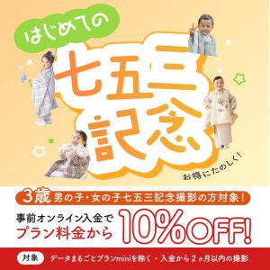 【七五三 】3歳初めての七五三撮影すると10%OFF!さらにオンライン相談すると10%!7月限定キャンペーンでお得に安く七五三撮っちゃおう☆