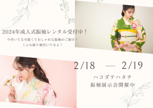 ぱれっと函館店では次の2024年式、2025年式に出席されるお嬢様たちの振り袖レンタルの受付を開始しております!!2024年の成人式振袖レンタル空き振袖のご紹介!函館成人式振袖展示会「ハコダテハタチ」2/18(土)2/19(日)開催決定!2024年(令和6年)に新成人を迎える方必見です!