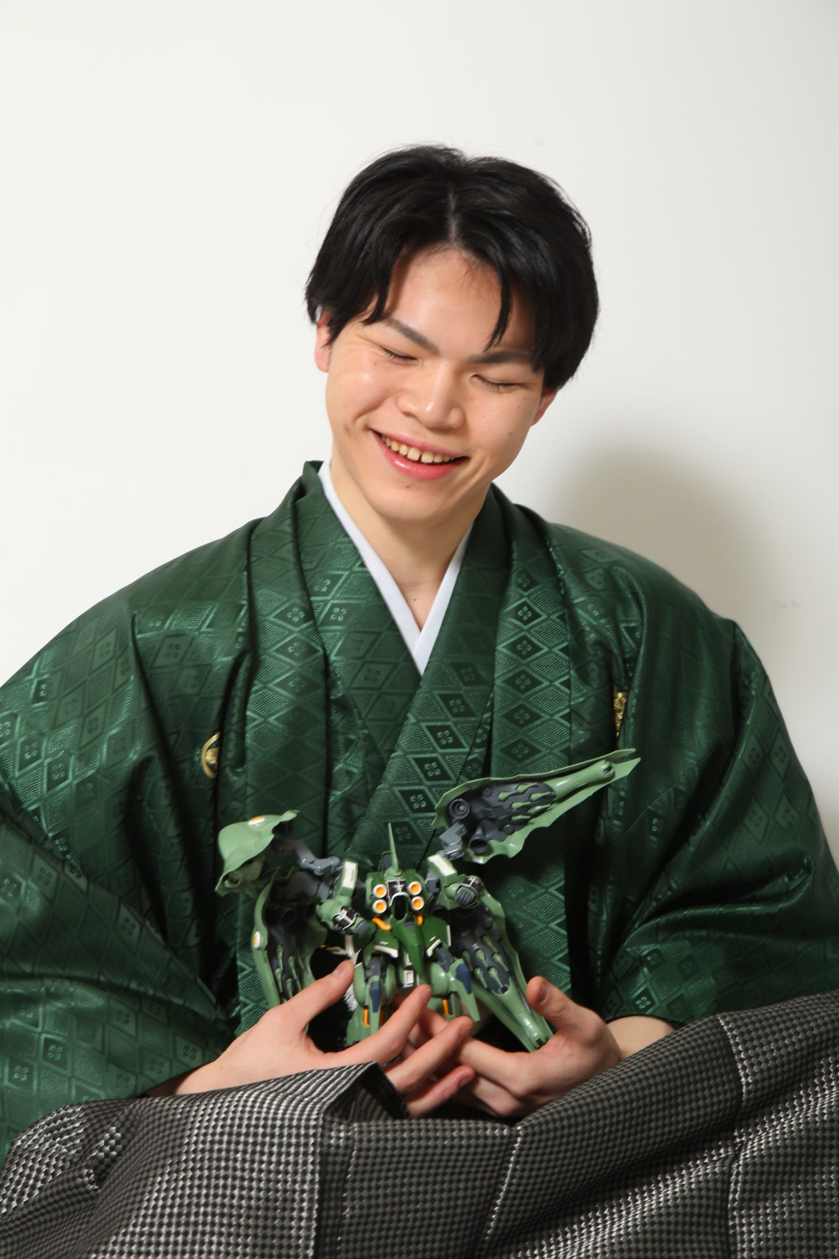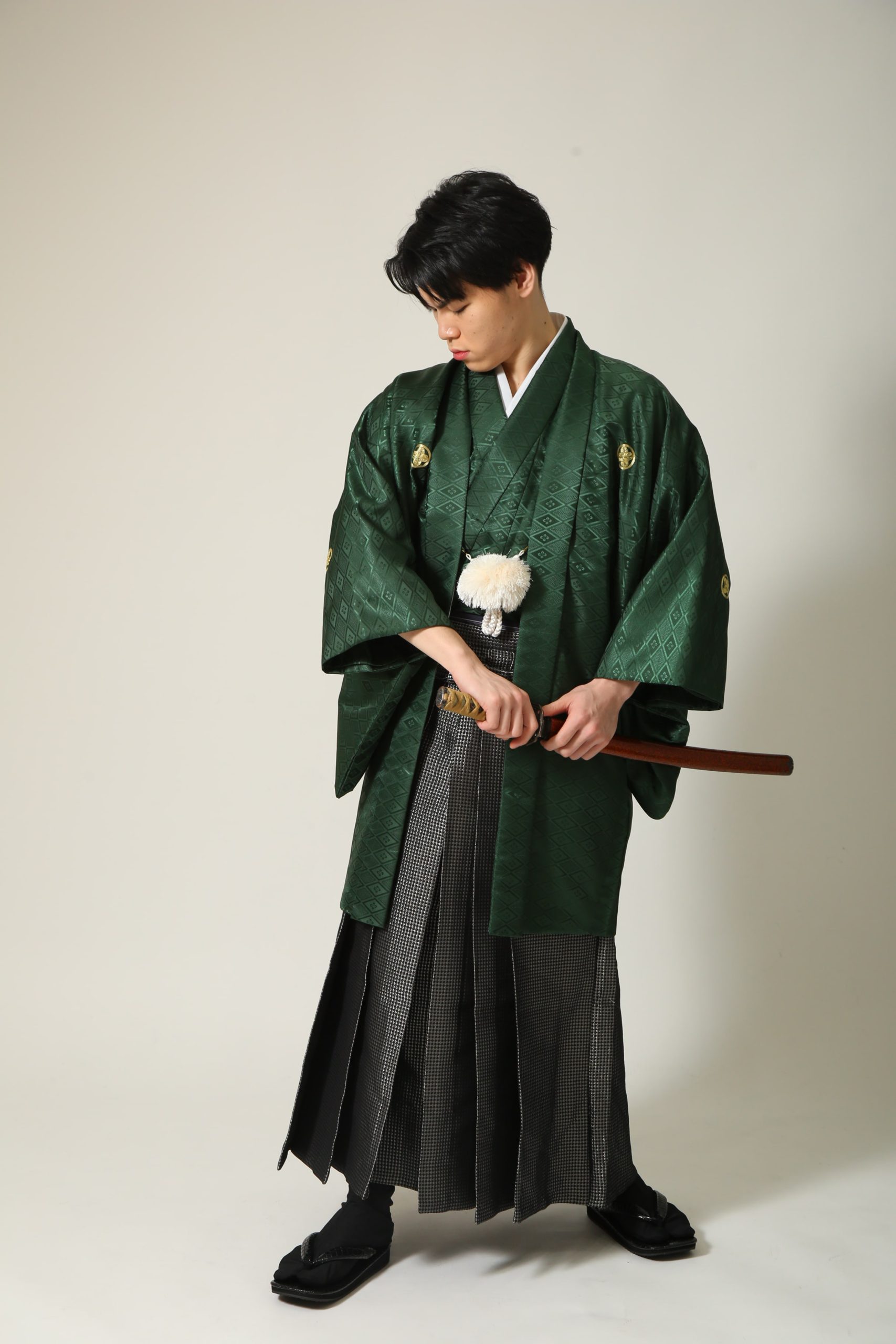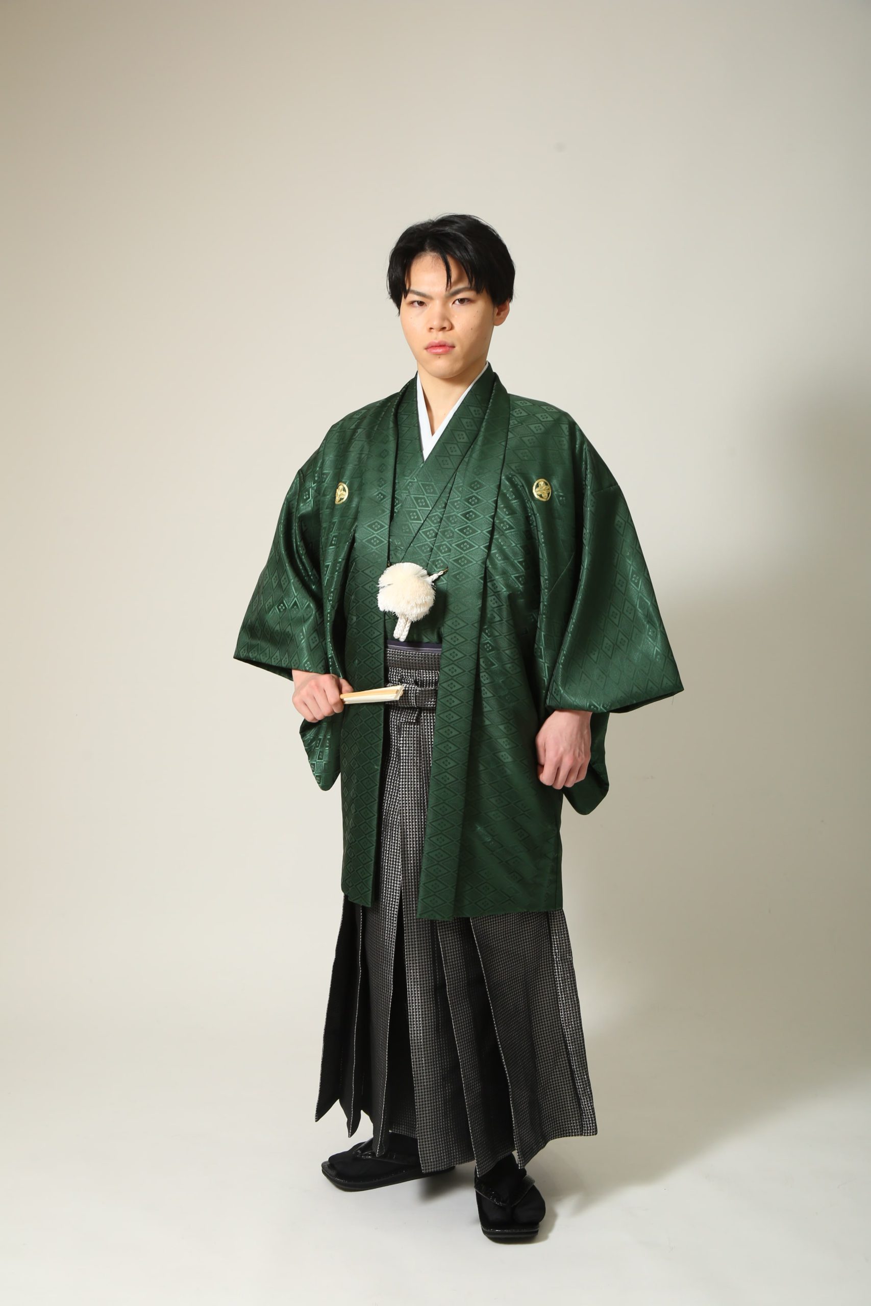 グリーンの羽織に、光沢のある黒のモダンな袴を合わせました
