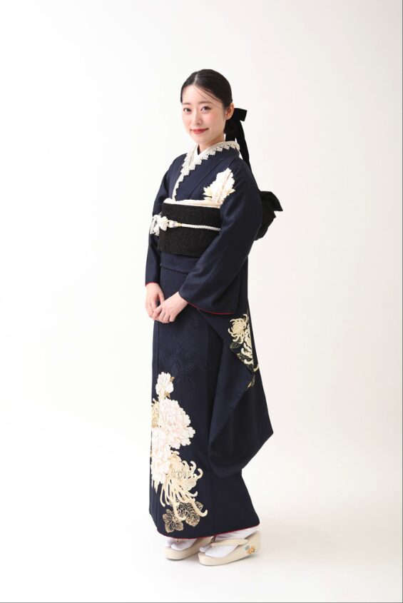 濃いめのネイビーに菊や牡丹のお花を大胆にあしらったシンプルなお振袖です