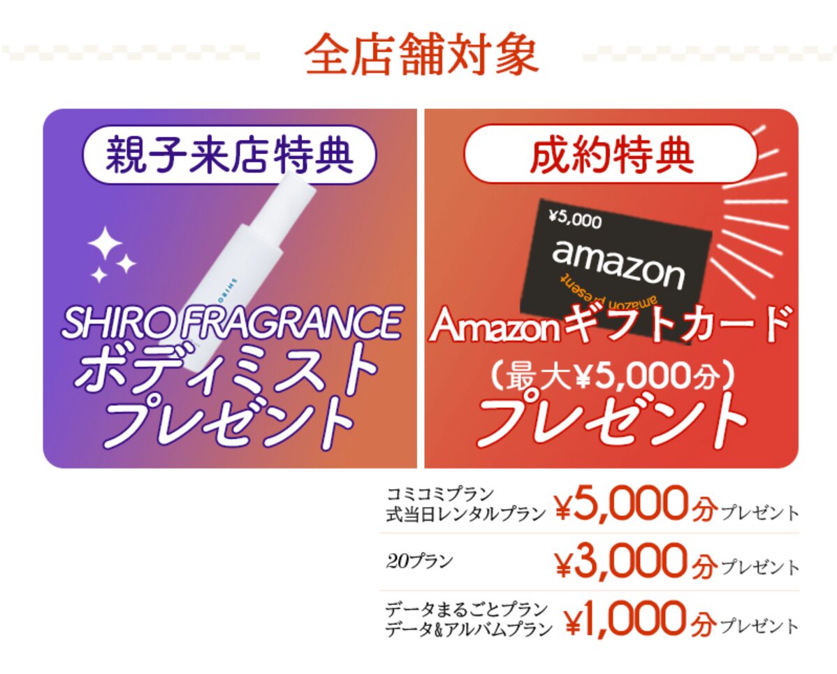 撮影種目:百日記念、ハーフバースディ、1歳お誕生日、七五三、入学、成人