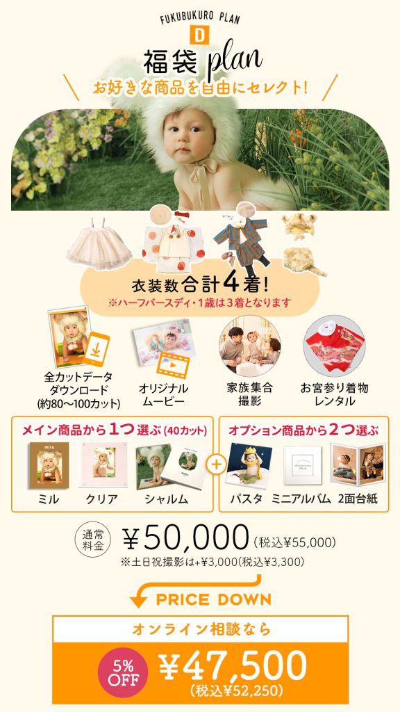 家族撮影通常¥6,050(税込)のところ、福袋プランご成約で1パターン無料でご案内。