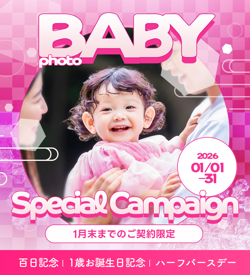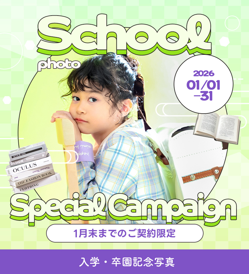 撮影種目:百日記念写真、ハーフバースディ、1歳お誕生日記念、七五三記念(男女)、入学記念写真