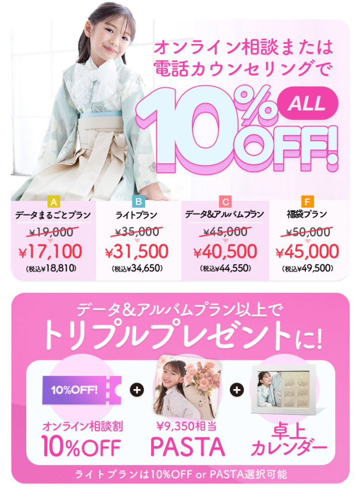詳しい予約の取り方や、衣装・スタジオについては、無料オンライン相談でお問い合わせ・ご予約ください!