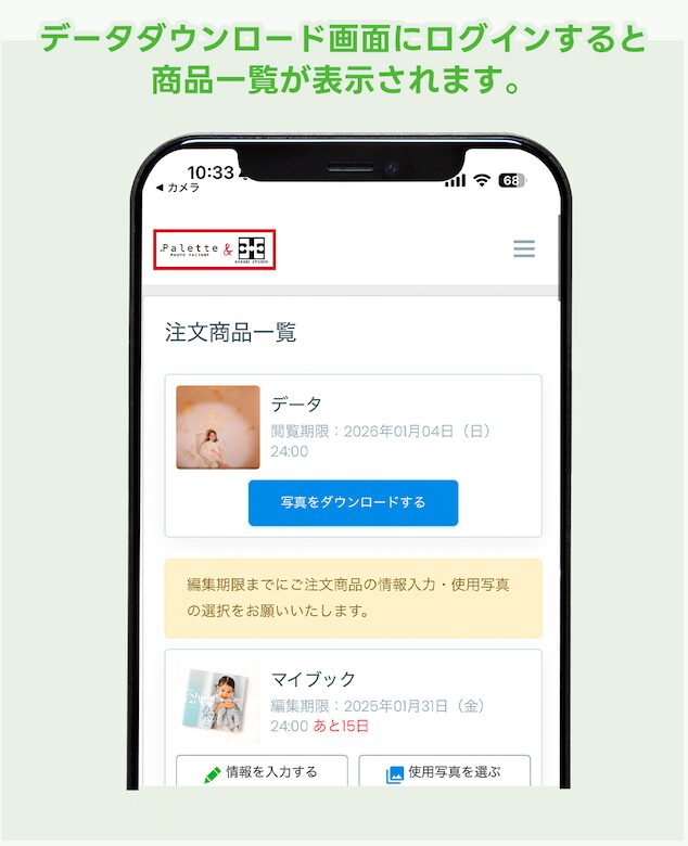 ログインすると、お客様が注文された「アルバム」や「データダウンロード」の商品名が表示されています。