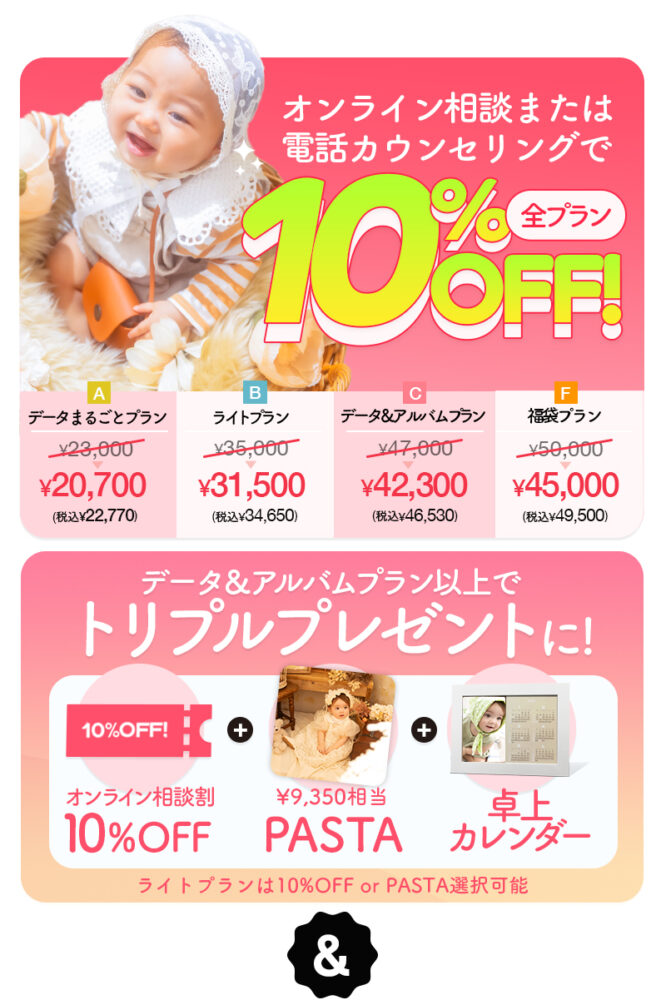 詳しい予約の取り方や、衣装・スタジオについては、無料オンライン相談でお問い合わせ・ご予約ください!