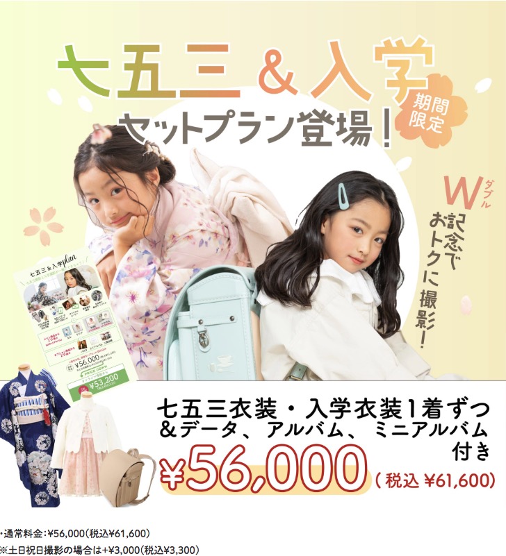 通常【七五三記念】と【入園・入学記念】はそれぞれ別の記念として撮影して頂いておりますが、期間限定でどっちの記念もいっぺんに撮れてしまう、夢のようなプランが登場!!