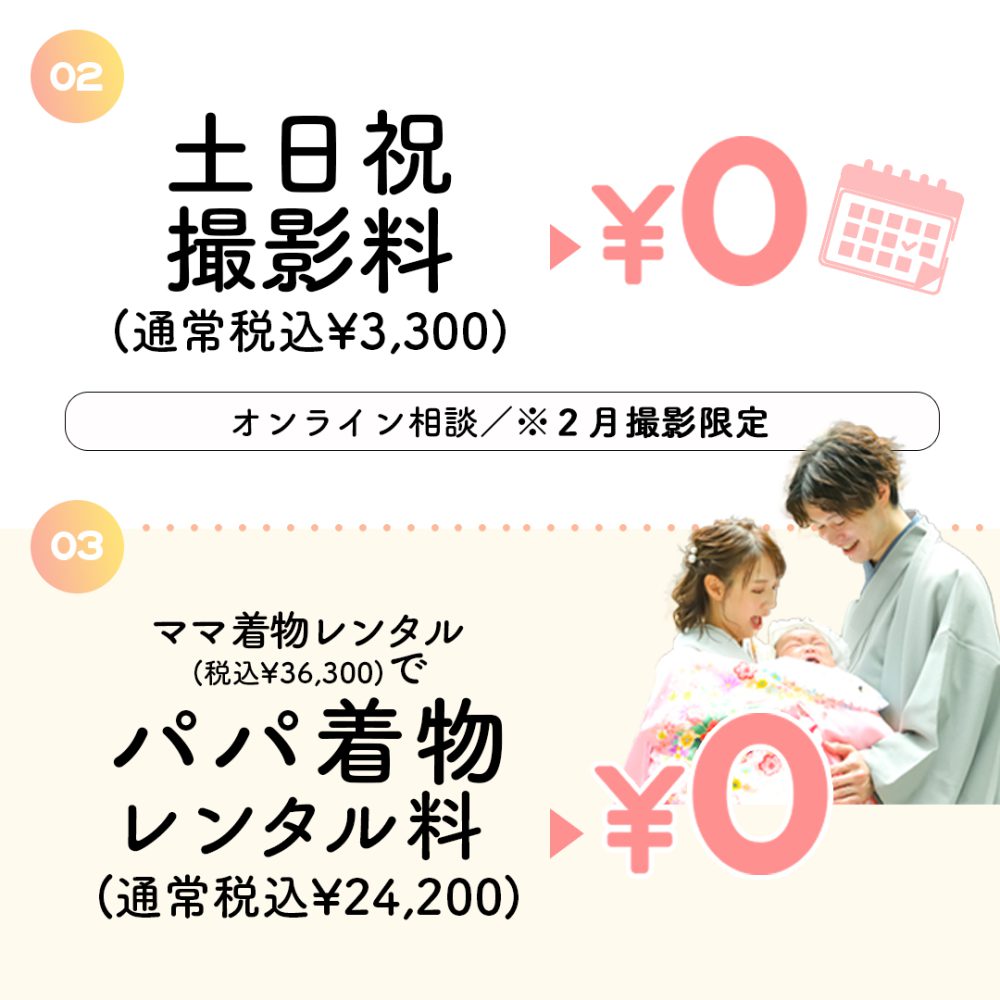 土日祝撮影料金(税込¥3300)が2月撮影限定、0円でご案内いたします。