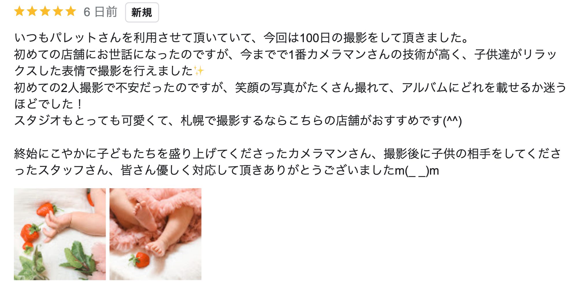 皆さんこんにちは! 北海道札幌市東区にあるpalette+plus東店です! 今回はベビー撮影いただいたお客様のリアルなクチコミをご紹介いたします! 1ヶ月以内にいただいたほやほやの声になります☆是非ご撮影の参考に下さいませ!
