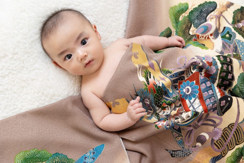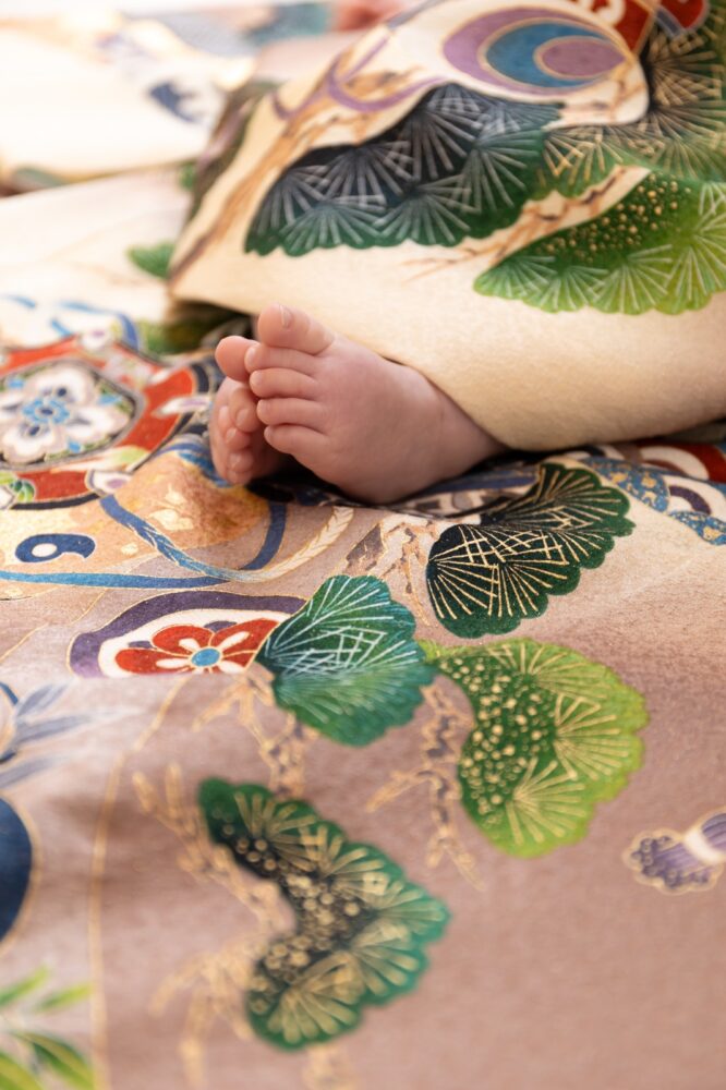 今回は東店から定番の伝統的な着物での撮影の他に、可愛く残せる百日の着物撮影のビジュアルをご紹介いたします!