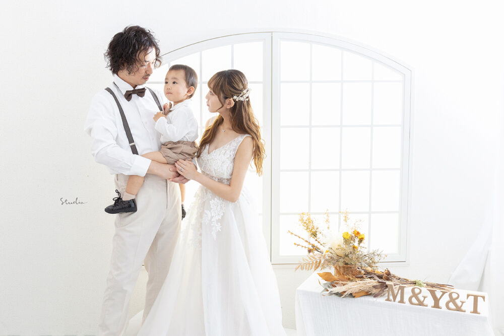 フォトスタジオでは、1歳の誕生日記念フォトに合わせたプランや衣装が用意されており、家族一緒に楽しむことができます。
