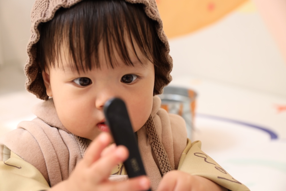 一歳さんはなんでも気になる時期!筆をジーーーっと眺めていました!
